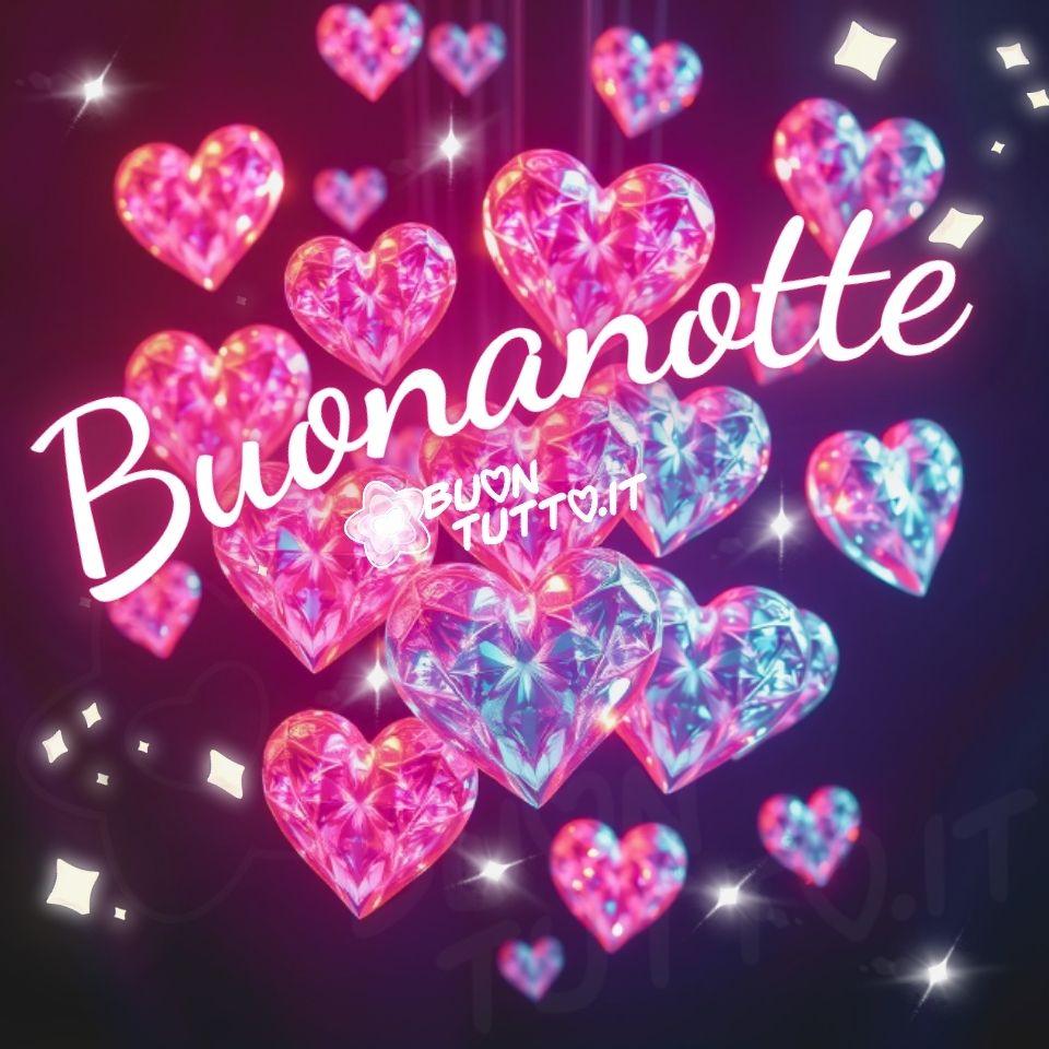 L’immagine mostra una composizione dinamica di numerosi cuori tridimensionali che sembrano fatti di cristallo sfaccettato dai colori caldi e luminosi. È un’immagine che comunica amore, affetto, preziosità… perfetta per augurare un’affettuosa buonanotte.
