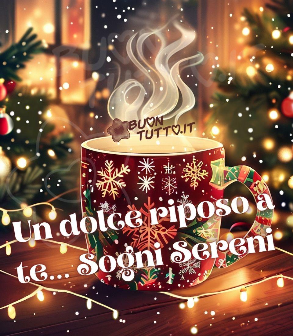 Una tazza fumante, decorata con fiocchi di neve e decorazioni natalizie, in un’atmosfera calda e accogliente per donare un dolce riposo e sogni sereni a tutte le persone che porti nel cuore.