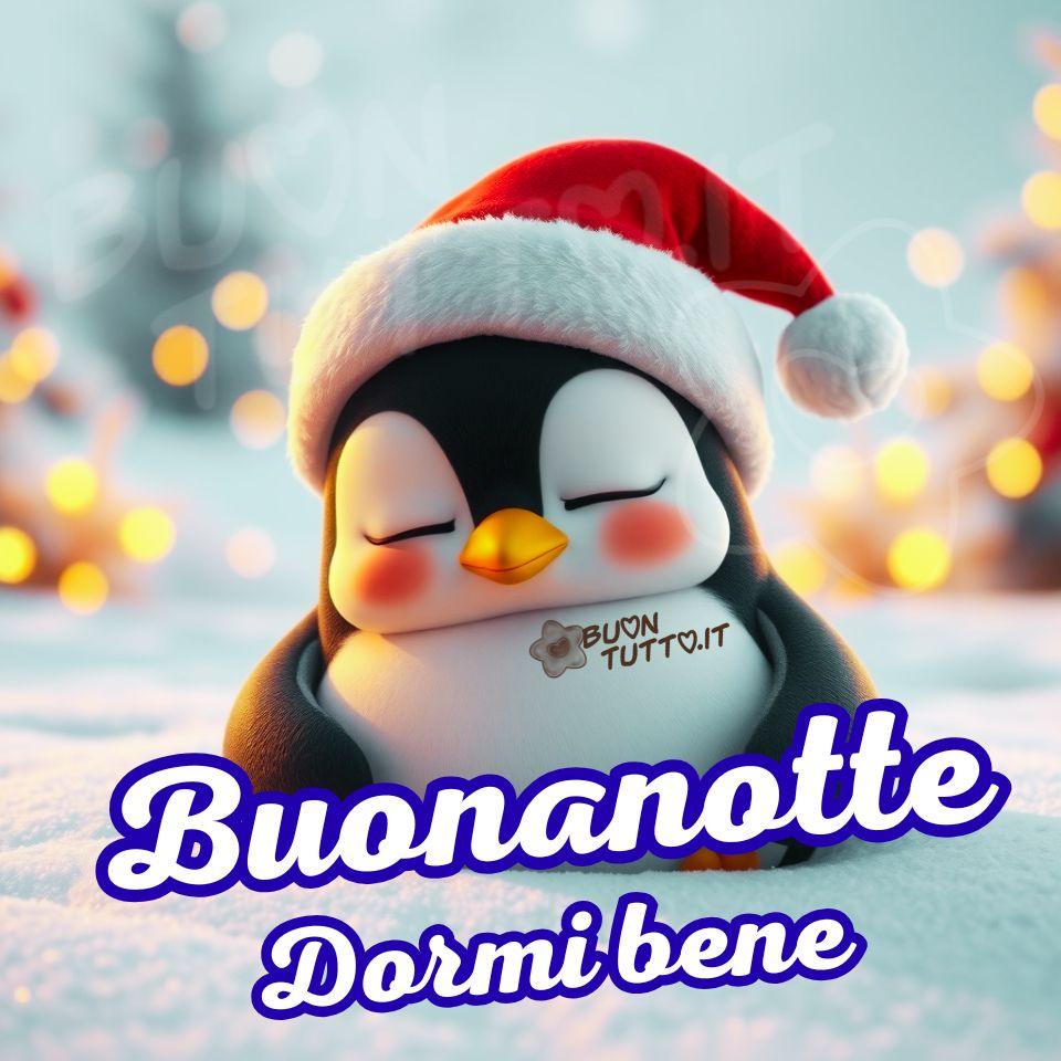 Buonanotte con un tenero e dolcissimo pinguino con cappello di babbo natale.