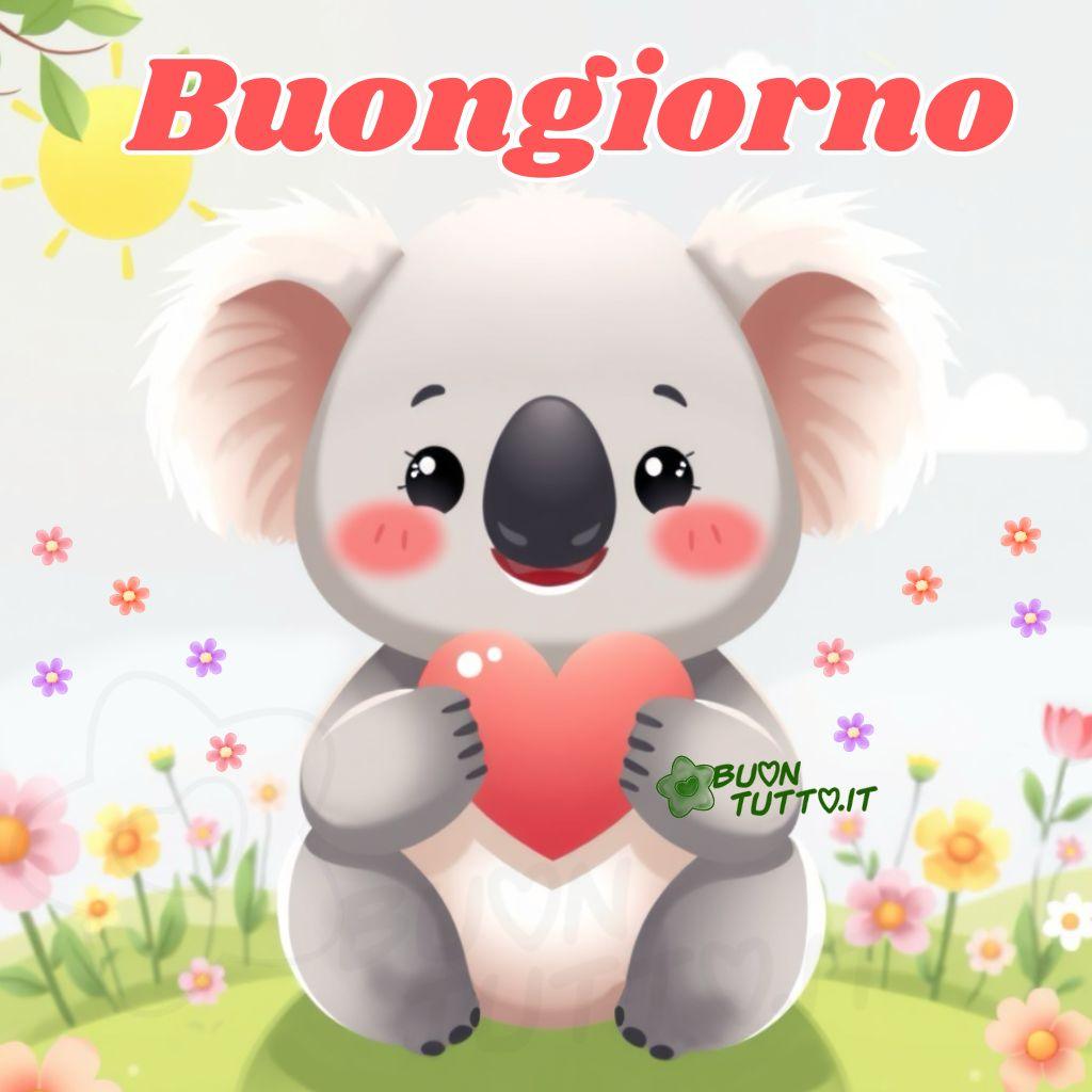 Un’illustrazione carina e accogliente di un koala che tiene in mano un cuore rosso. È seduto in un prato verde con fiori colorati e c’è un sole splendente nel cielo. Un’immagine che trasmette dolcezza, gioia e affetto, perfetta per augurare il buongiorno.