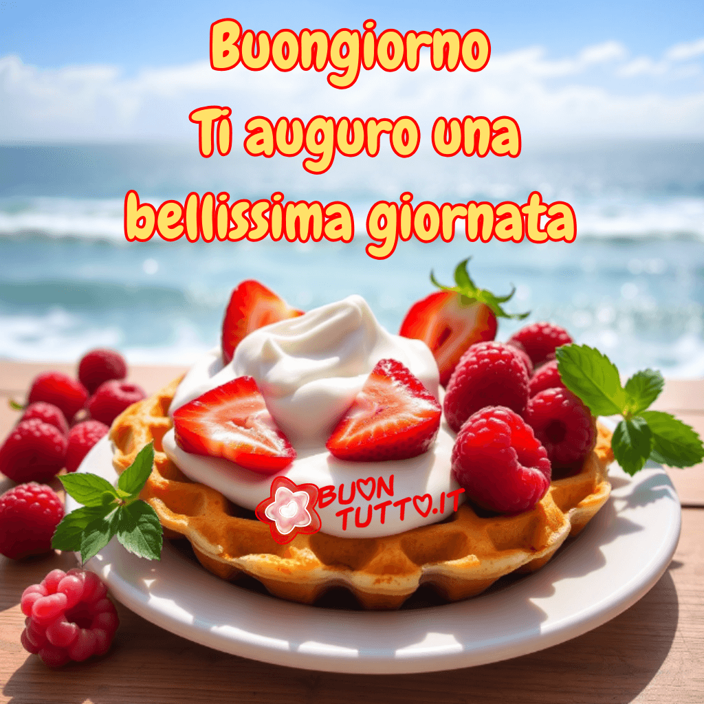 Un soffice e dorato waffle con una nuvola di panna montata, così soffice da sembrare appena fatta. È decorato con fragole e lamponi. Sullo sfondo, i raggi del sole accarezzano il mare. Una colazione perfetta per augurare una bellissima giornata! 🍓☀️